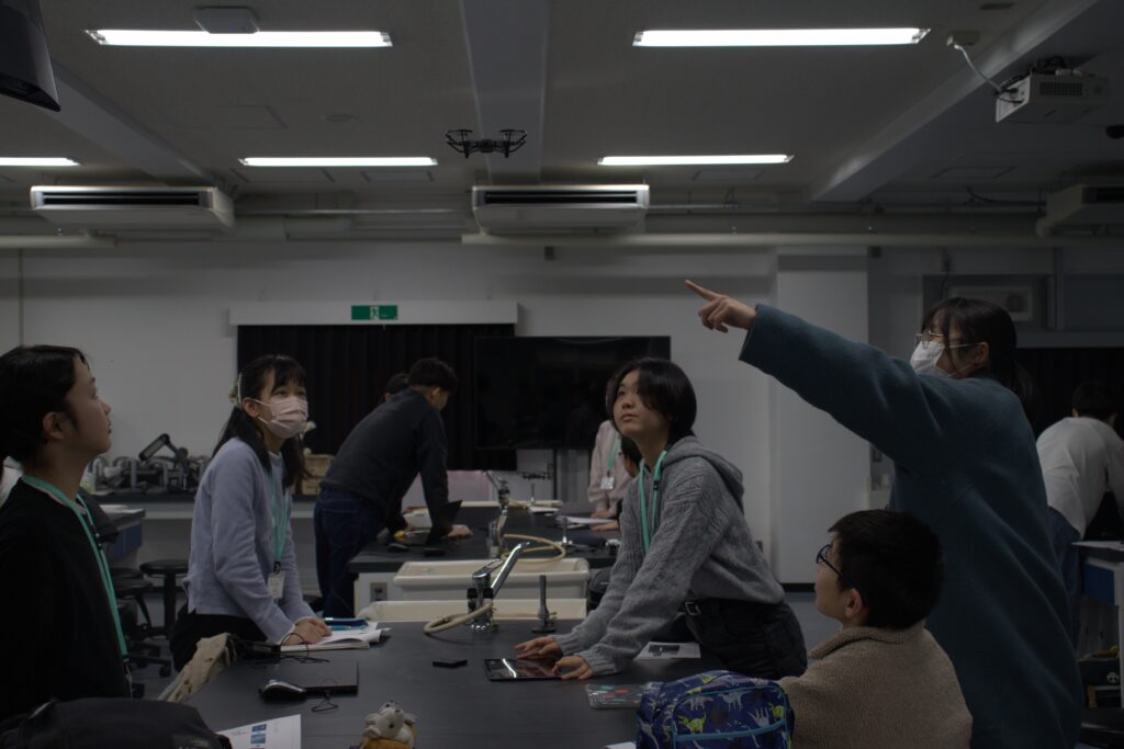 教室の天井があまり高くないこともあり、「まずは30cmだけ上昇させてみよう」「机の高さを基準にしよう」など、衝突を避けるための工夫をグループ内で話し合いながら進めていました。