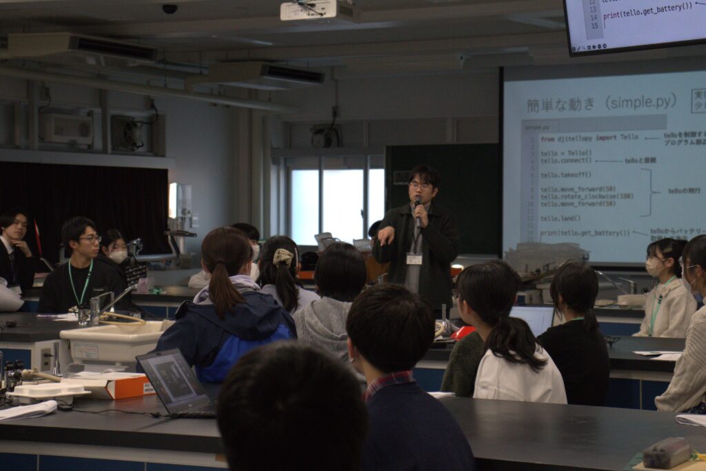市川先生は教育用ドローン「Tello」を活用したプログラミング教育に長く携わっており、ドローンの基礎構造から自律飛行の仕組み、さらには社会での応用まで幅広く紹介してくださいました。
