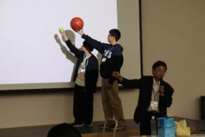先生はボールやコインを使い、重力波や月食などを実験でわかりやすく紹介しました。