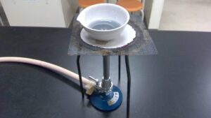 Ⅲ 蒸発皿に亜鉛粉末2〜3gを入れ、Ⅰで作ったNaOH水溶液を蒸発皿の3分の1ほどの高さまで加え加熱します。