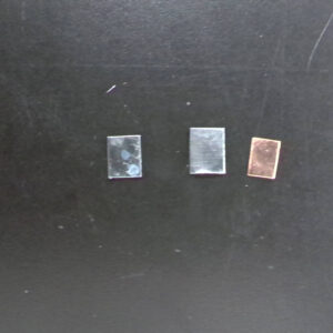 Ⅵ 両面の色が変化したら、金属板をピンセットでつまんで、ざるに入れ、水道水でよく表面を洗い流します。洗い流したものがこちらです。(3枚比較)