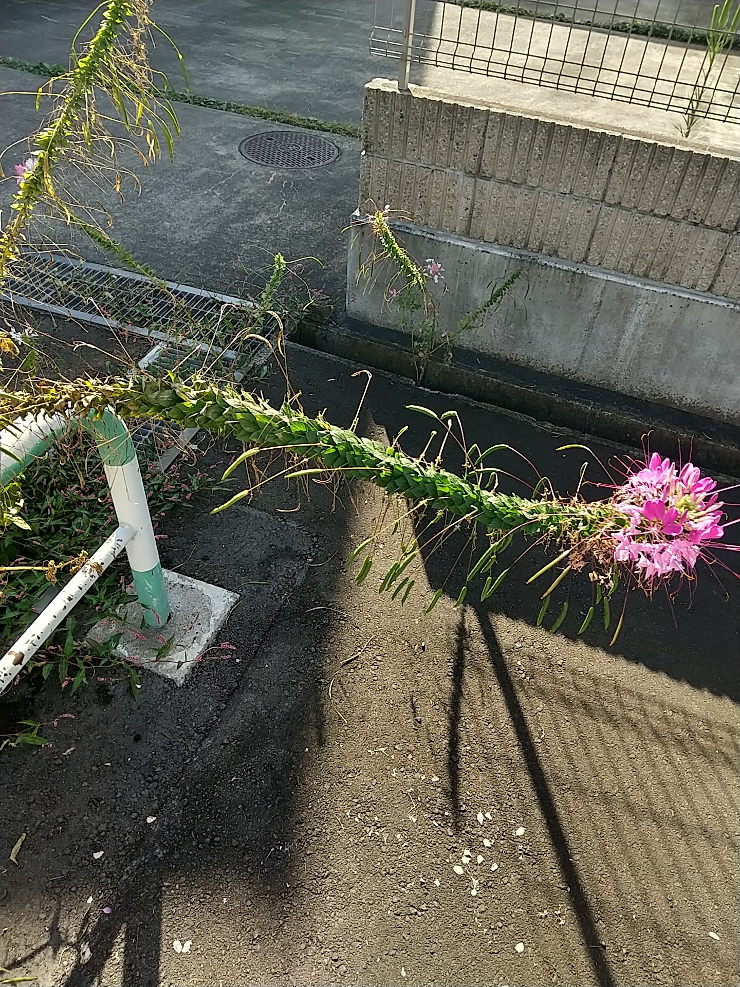 ひとつは、セイヨウフウチョウソウというフウチョウソウ科の植物。別名クレオメ、漢字にすると「西洋風蝶草」です。その名の通り、蝶が舞い上がって飛んでいる姿からついたそうです。明治時代に観賞用として入り、こぼれた種から育つこともあるようです。近くの家に似たような花があったので、何らかの理由で種が運ばれたのだと思います。