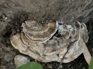 庭の倒木に生えていたクジラタケを見つけました。クジラタケの学名はTrametes orientalisで、サルノコシカケ科シロアミタケ属に属する多孔菌です。このきのこは、棚状に広がる傘が特徴で、直径は4センチから20センチを超えるものまであり、白から灰白色、時には淡い褐色を帯びています。表面は滑らかで細かい毛に覆われ、放射状のしわが見られることがあり、コルクのような硬い質感が印象的です。裏側には、白くて細かい管孔が整然と並び、0.5~2ミリの小さな丸い孔が蜂の巣のように密集しています。この管孔は胞子を放出するための構造で、指で軽く触ると柔らかく、少し凹む感触があって、かわいらしいです。幼い個体は特に肉厚で丸みを帯び、白く盛り上がった姿が可愛らしく、成長するにつれて傘が広がり環紋がうっすら現れる変化も観察していて楽しいです。クジラタケは腐生菌で、広葉樹の枯れ木、倒木、切り株に生え、リグニンやセルロースを分解して木材を白く腐朽させます。この働きが森の土壌循環を支え、次の植物の栄養源を作り出しているのです。ユーカリの倒木に生えたのは、湿気と有機物が豊富な環境がぴったり合ったからだと考えています。日本全国、北海道から沖縄まで分布し、ほぼ一年中見られます。特にシイタケのほだ木に大量発生すると栽培の邪魔になるそうで、そうなってしまうとシイタケの収穫は諦めた方が良いそうです。かなり身近なきのこですね。🍄寒い季節でも硬い菌体が残るので、冬の庭散策でも出会えるのが嬉しいポイントです。名前の「クジラタケ」の由来は、残念ながら不明です。文献や資料を調べてみましたが、はっきりした理由はわかっていません。ただ、動物にちなんだきのこの名前は他にも多く、ムジナタケやキツネノチャブクロのように、自然の連想から生まれたのかもしれません。あまりクジラには似ていませんよね。棚状の白い姿がクジラの背びれを思わせるという説もありますが、私が見た個体はむしろ大きな白いクラゲや、木に張り付いた陶器の欠片のように感じました。遠目には目立つけど、クジラのダイナミックさとは随分違うので、名前の由来が余計に気になります。このクジラタケの魅力は、何と言ってもその管孔の美しさです。幼菌の純白で厚みのある可愛らしい姿から、成長した灰色の硬い棚まで、表情の変化が豊かで、毎回新しい発見があります。庭や公園の枯れ木を探すだけで見つかる身近さも魅力で、派手さはないけれど、じっくり観察すると森の静かな循環を教えてくれます。遠目からでも白く目立つので、散策のサプライズとしてぴったりです。好奇心から、クジラタケを少し齧ってみました。よくわからない味で、硬くて木質っぽく、ほとんど風味がありませんでした。ただ、鼻を近づけるとエノキみたいな独特の匂いがして、少し新鮮なきのこの香りが混じった感じです。もちろん、食用には向かないのでおすすめしませんが、こんな小さな実験でさらに親近感が湧きました。硬くて消化に悪いし、食毒も不明なので、絶対に真似しないでくださいね。庭で見つけたクジラタケは、切り株の上で静かに分解を進め、庭の小さな生態系を支えています。白い管孔の精密さと、名前の謎めいた魅力に触れると、自然の奥深さを改めて実感します。皆さんも庭を歩くときは、他の切り株や枯れ枝にも目を凝らしてみてくださいね。きっと、クジラタケのような地味だけど心惹かれるきのこが待っているはずです。この発見で、日常の庭が少しだけ豊かになりました。
