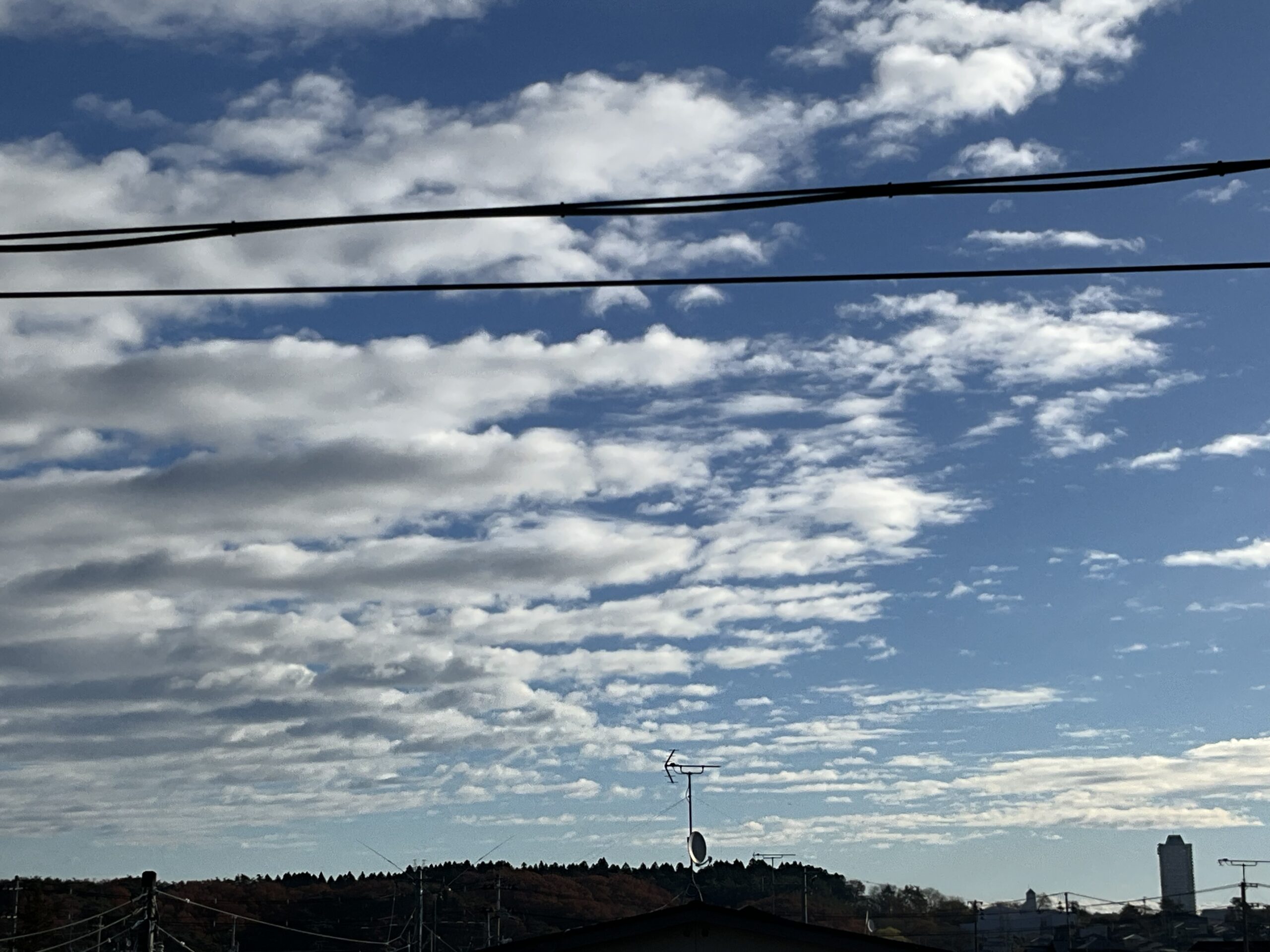 今日は家の窓から鰯雲が見えました。鰯雲は巻積雲や高積雲のうちの一つで、他にも羊雲や鱗雲などがあります。雲の下の気温が高くなり、雲の上の気温が低くなると、対流が起こることによって発生します。温帯低気圧の後面を低気圧とともに移動していく高気圧(移動性高気圧)の後ろに見られることが多いため、秋に見られることが多く、秋の季語としても使われているそうです。